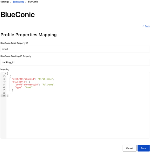 - An input which takes an array of JSON objects, used to map chosen Zephr User Attributes to chosen BlueConic Profile Properties.The format of the expected input is as follows: